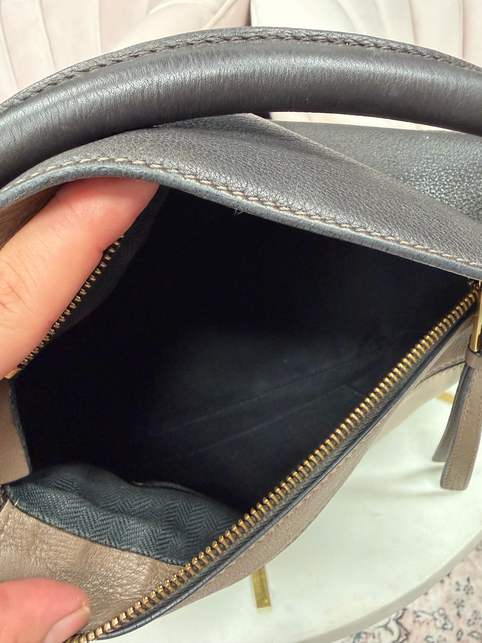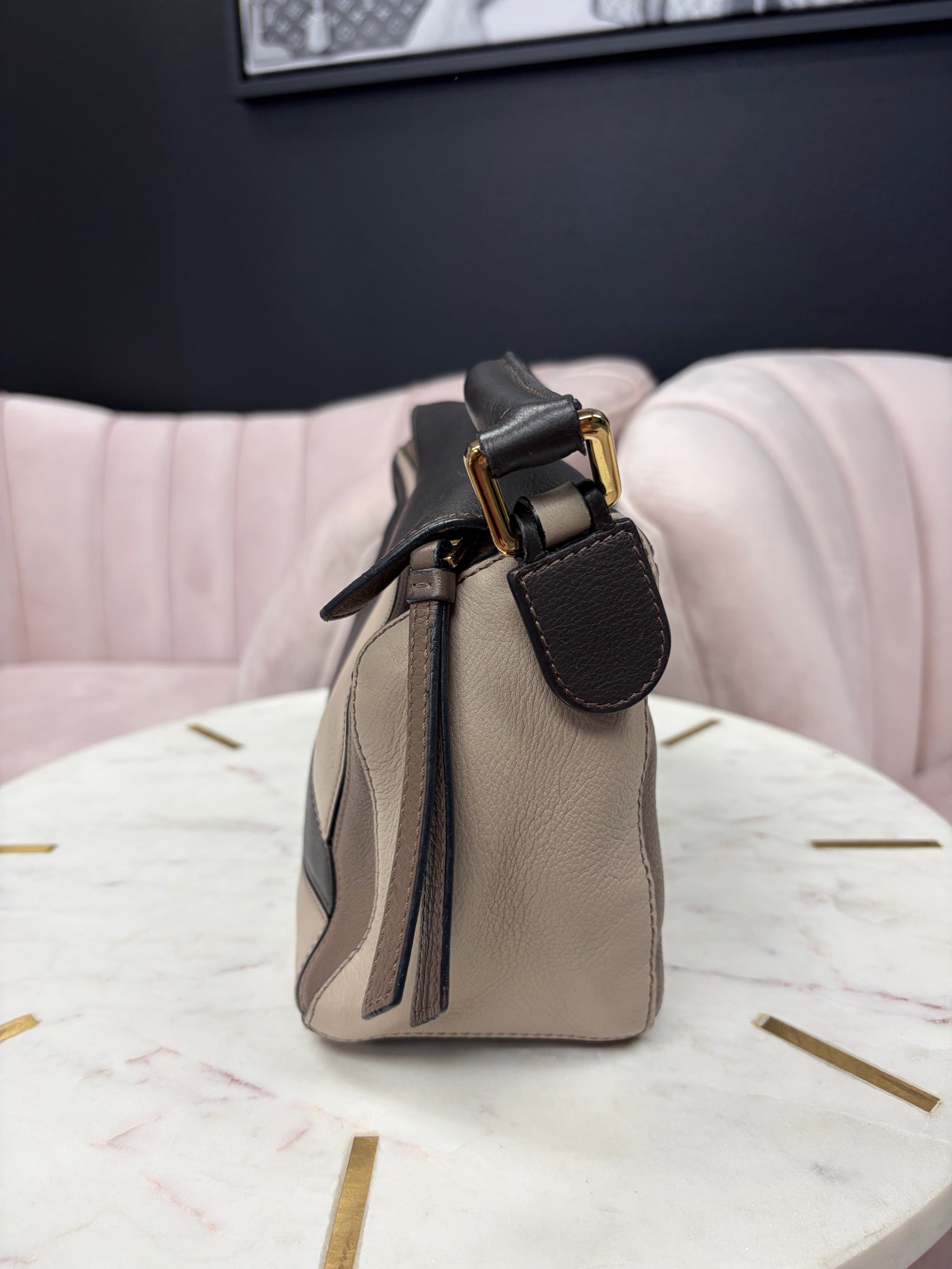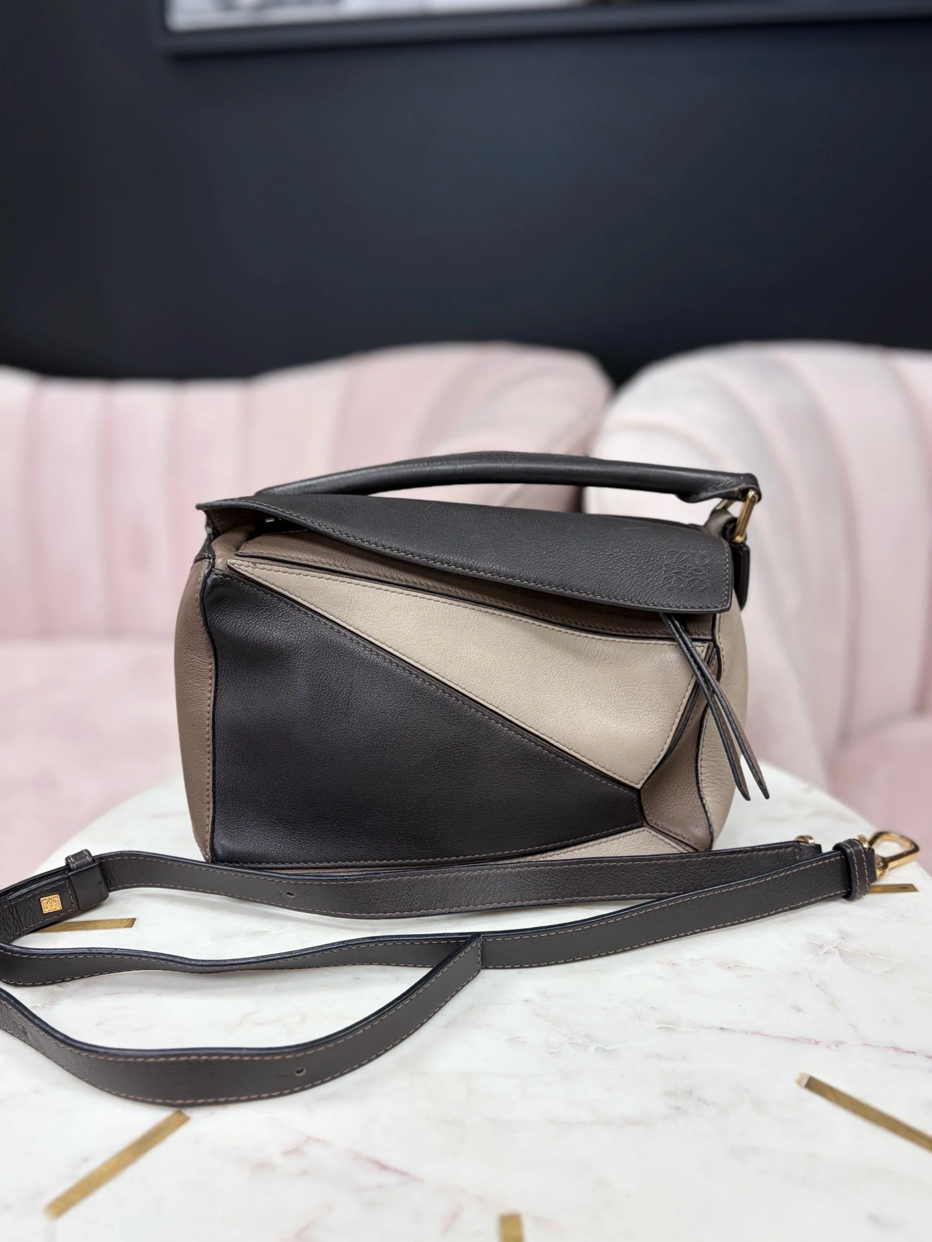 LOEWE Puzzle Bag, in a tricolor grey, beige, and black leather combinationAdjustable and removable black leather strap.