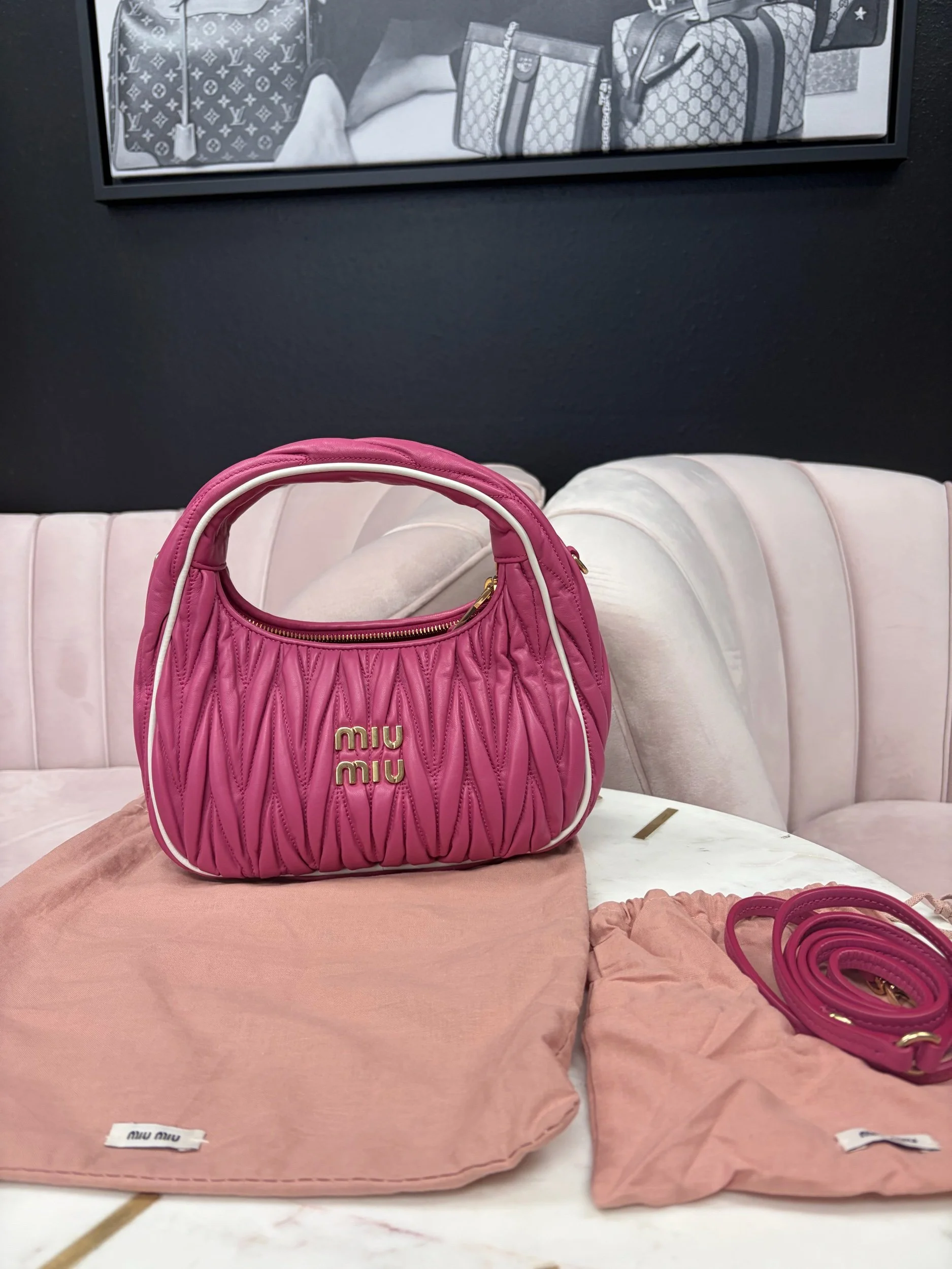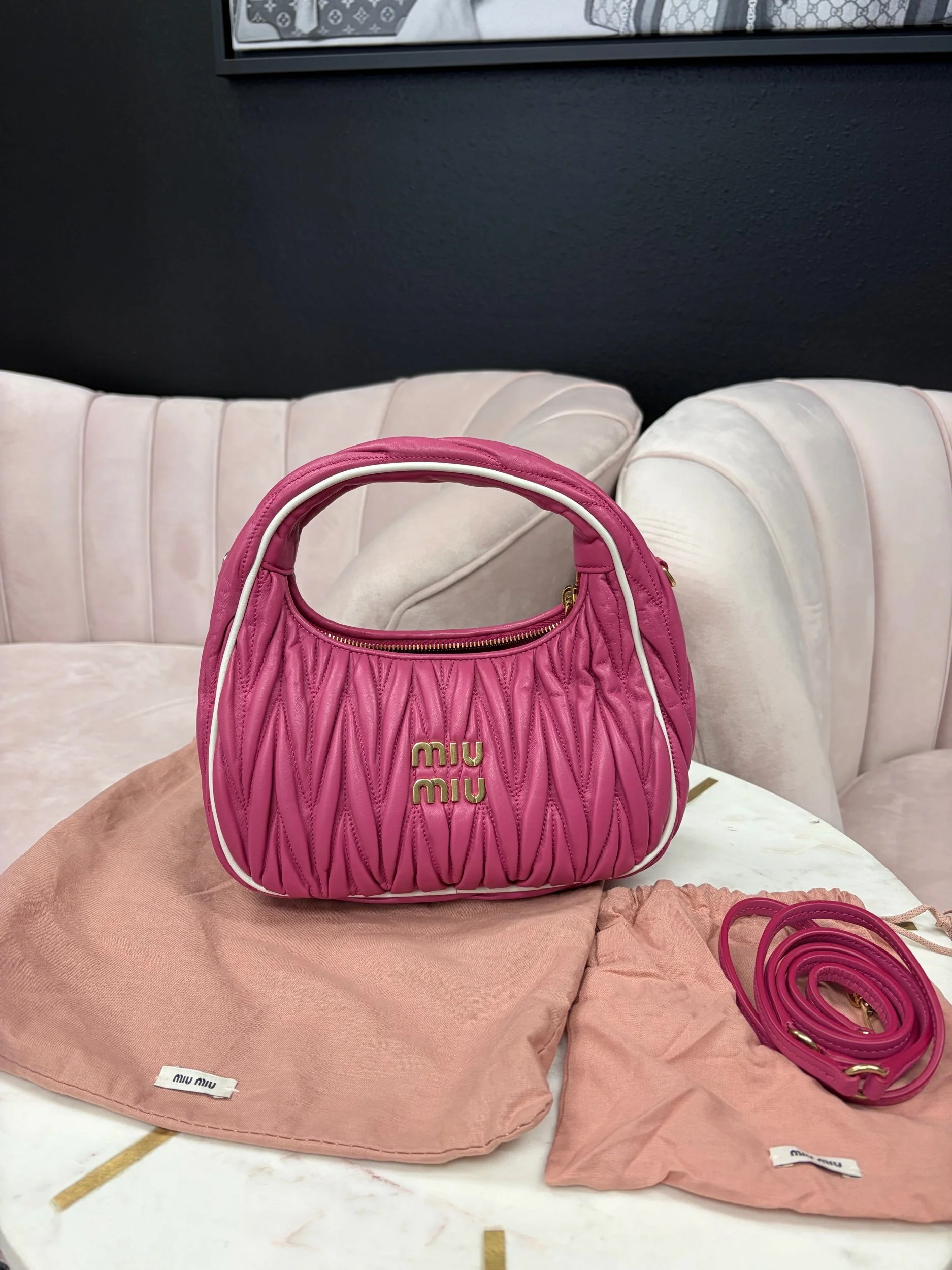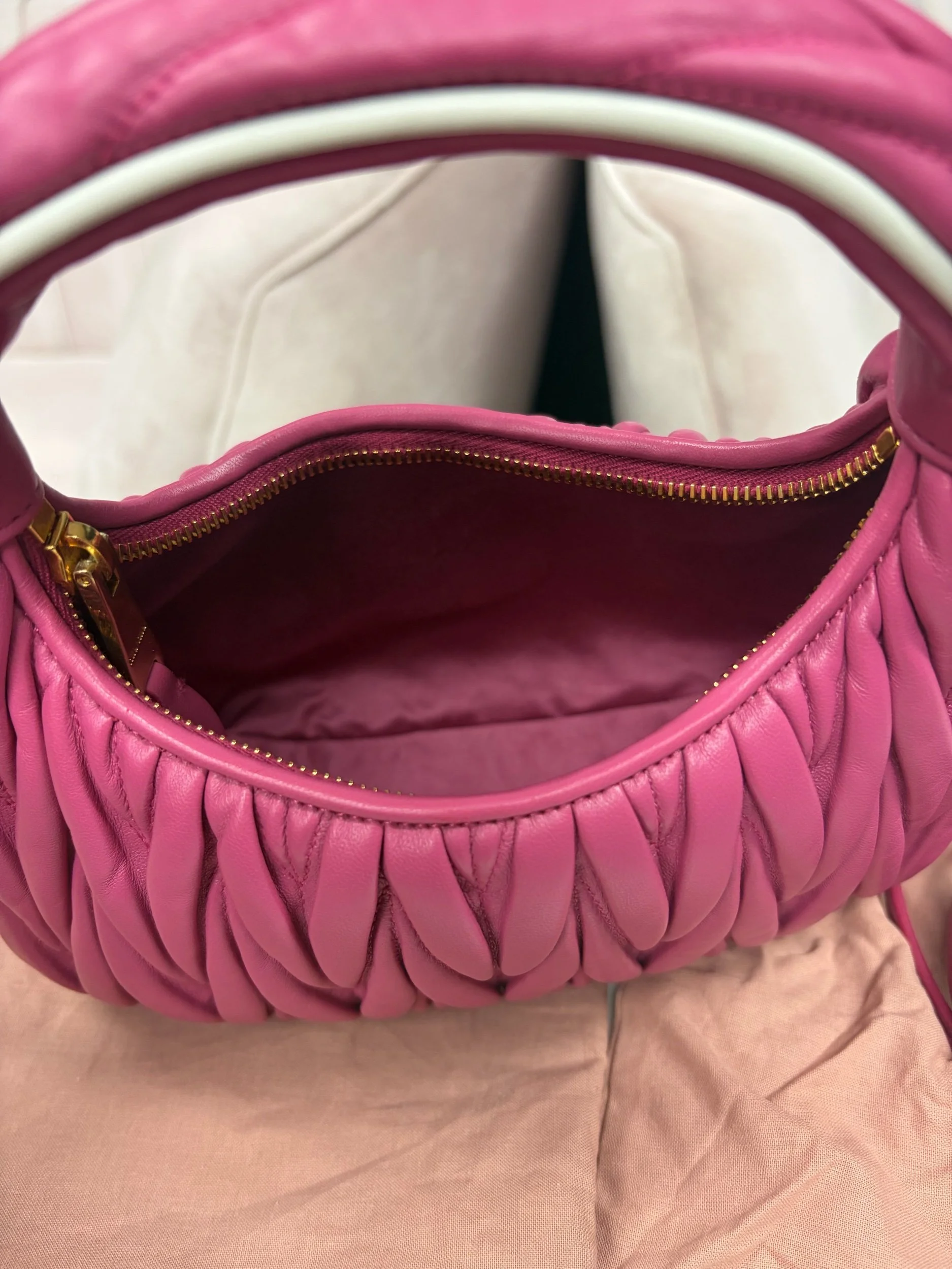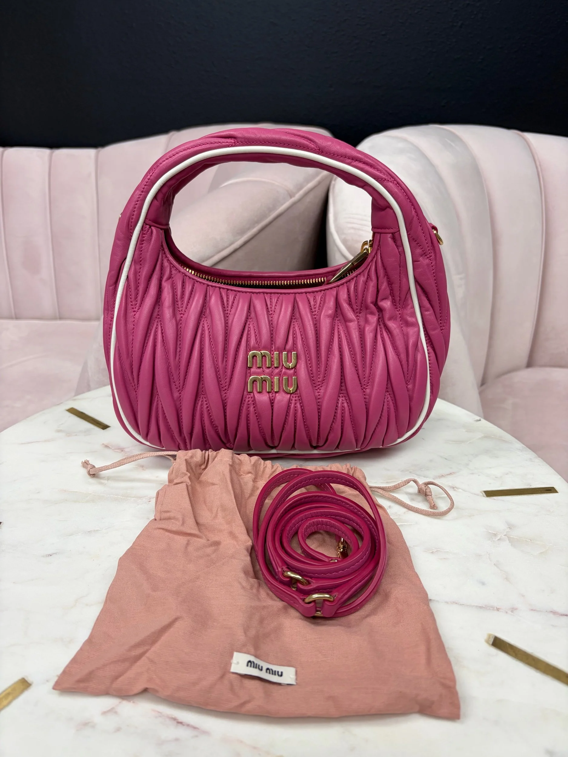 Image 1 of 8 Image 2 of 8 Image 3 of 8 Image 4 of 8 Image 5 of 8 Image 6 of 8 Image 7 of 8 Image 8 of 8 Miu Miu Wander Matelassé Hobo Bag $1,800.00 Miu Miu Wander Matelassé Nappa Leather Hobo Bag in fuchsia pink. Comes with removable strap. Purchase Added! Miu Miu Wander Matelassé Nappa Leather Hobo Bag in fuchsia pink. Comes with removable strap.