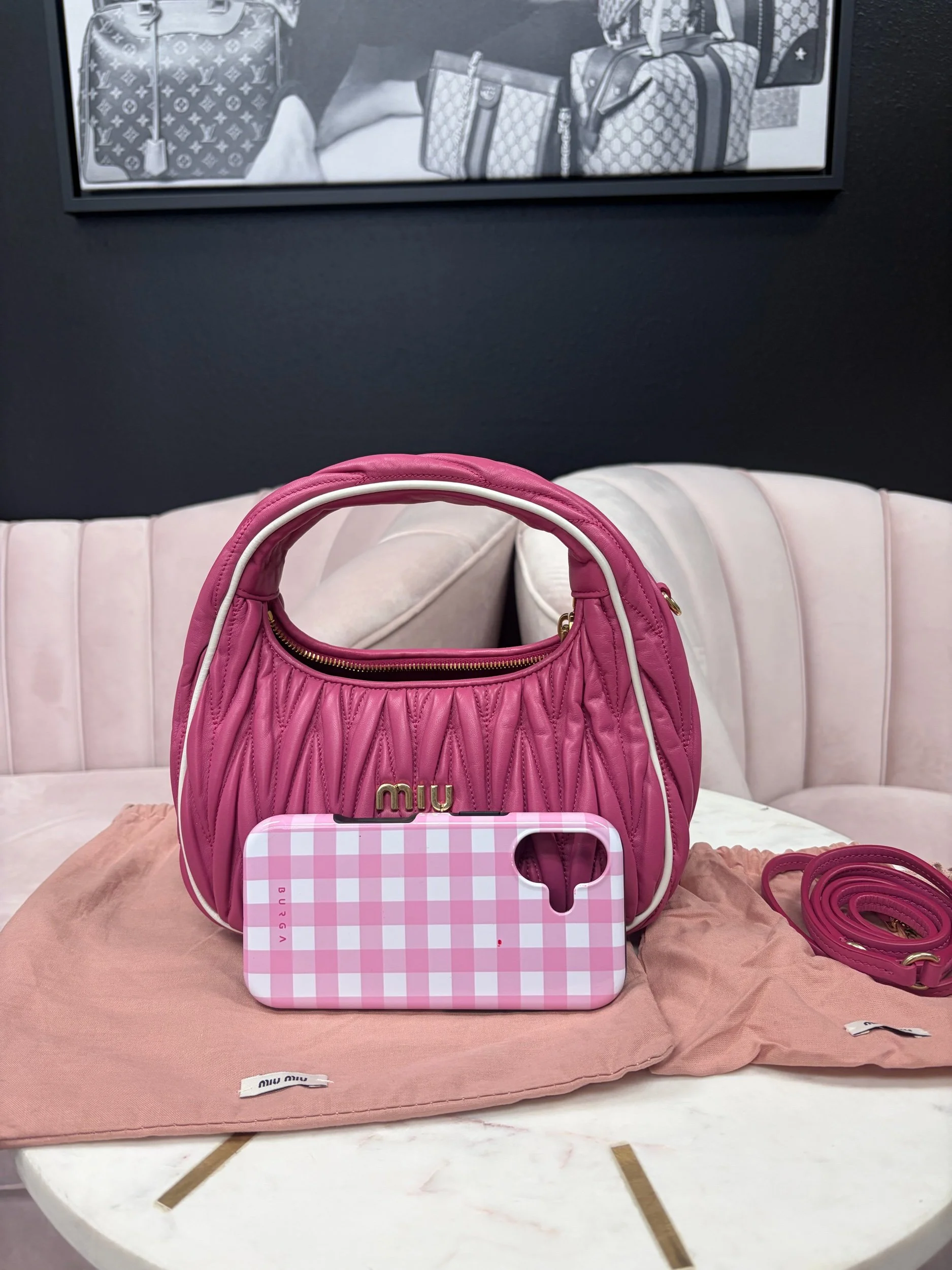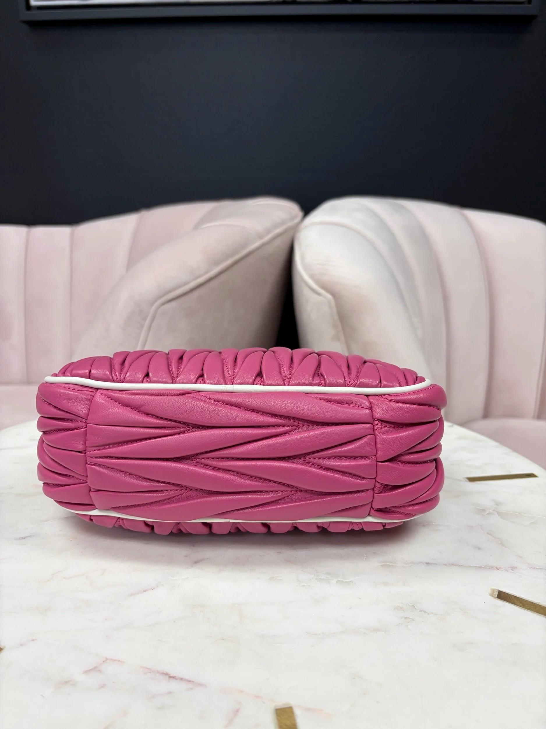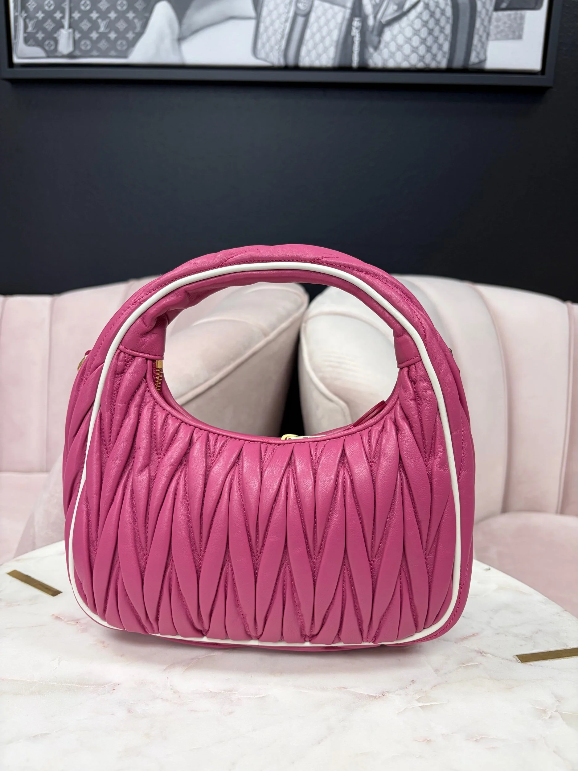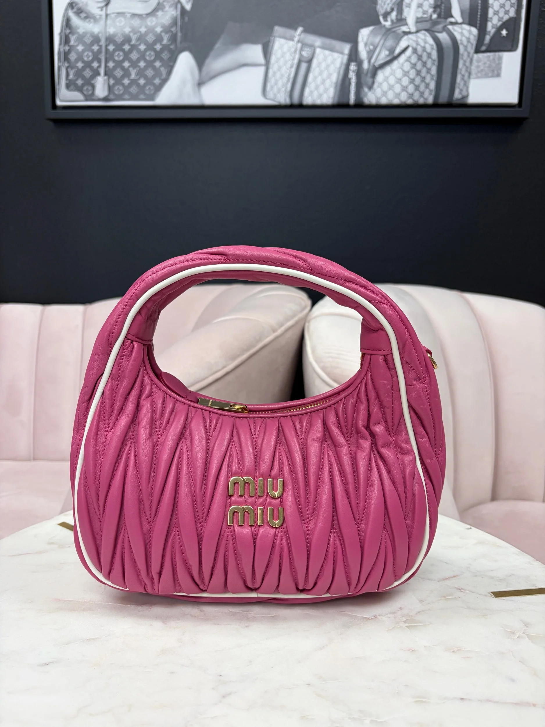 Image 1 of 8 Image 2 of 8 Image 3 of 8 Image 4 of 8 Image 5 of 8 Image 6 of 8 Image 7 of 8 Image 8 of 8 Miu Miu Wander Matelassé Hobo Bag $1,800.00 Miu Miu Wander Matelassé Nappa Leather Hobo Bag in fuchsia pink. Comes with removable strap. Purchase Added! Miu Miu Wander Matelassé Nappa Leather Hobo Bag in fuchsia pink. Comes with removable strap.