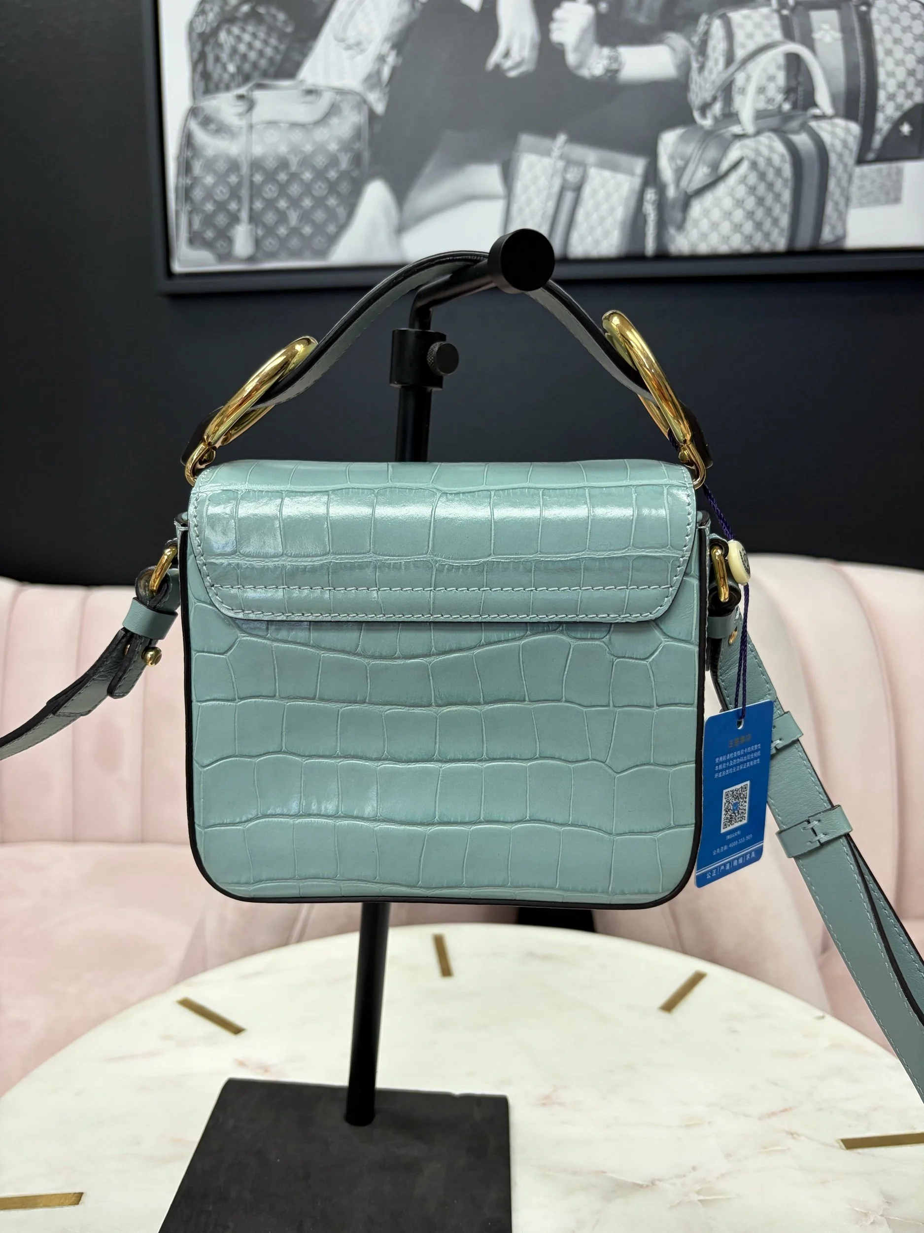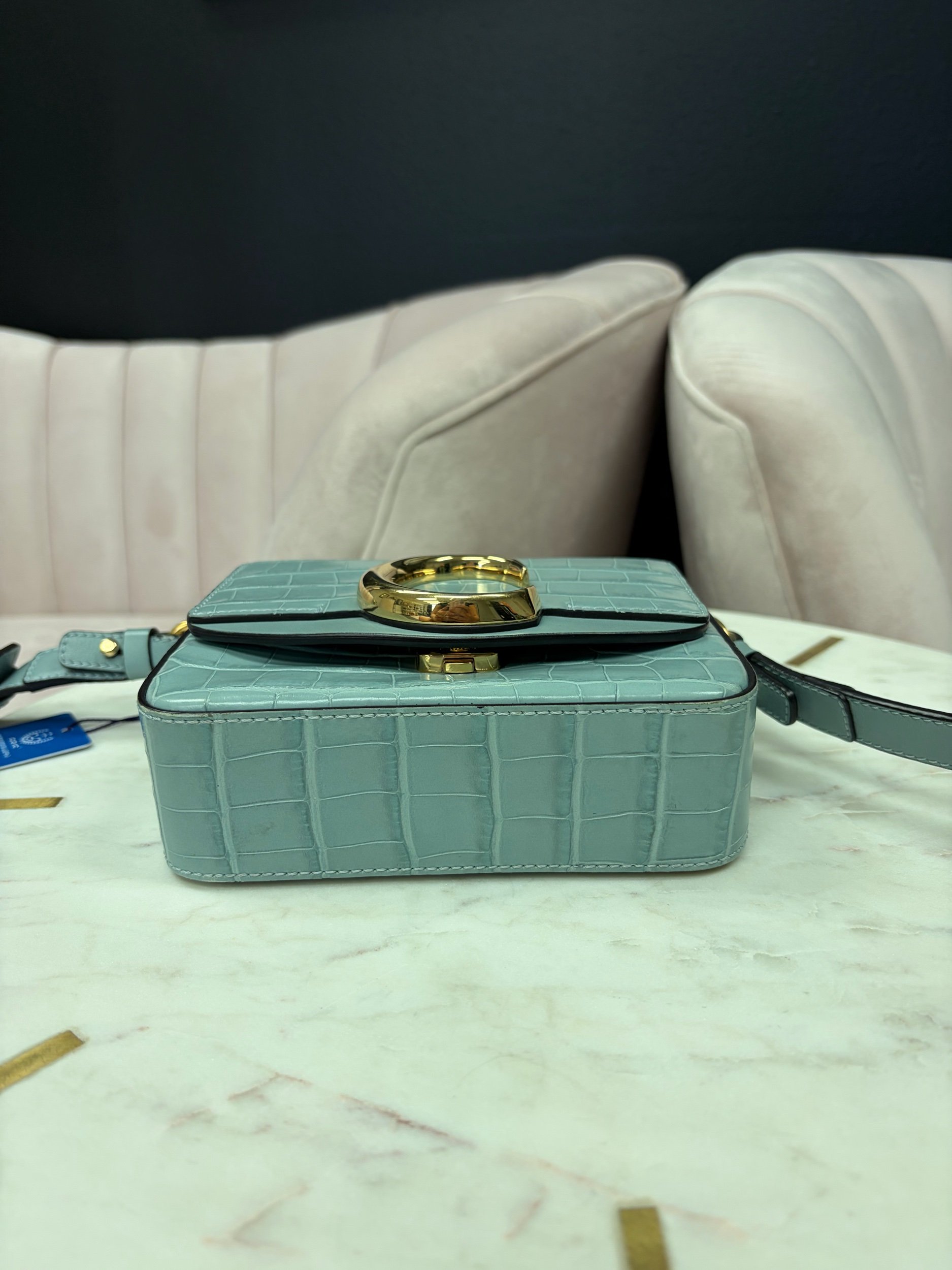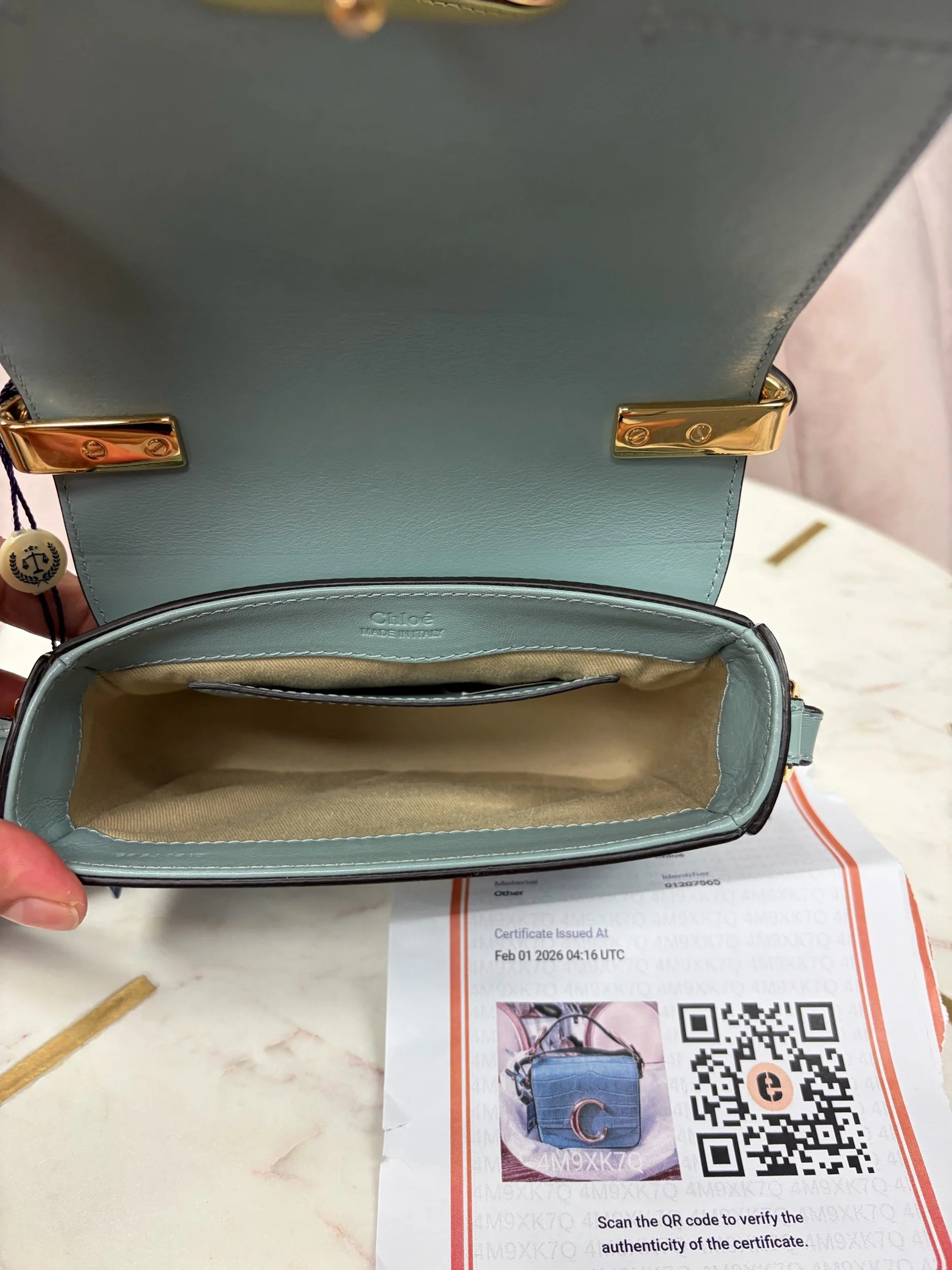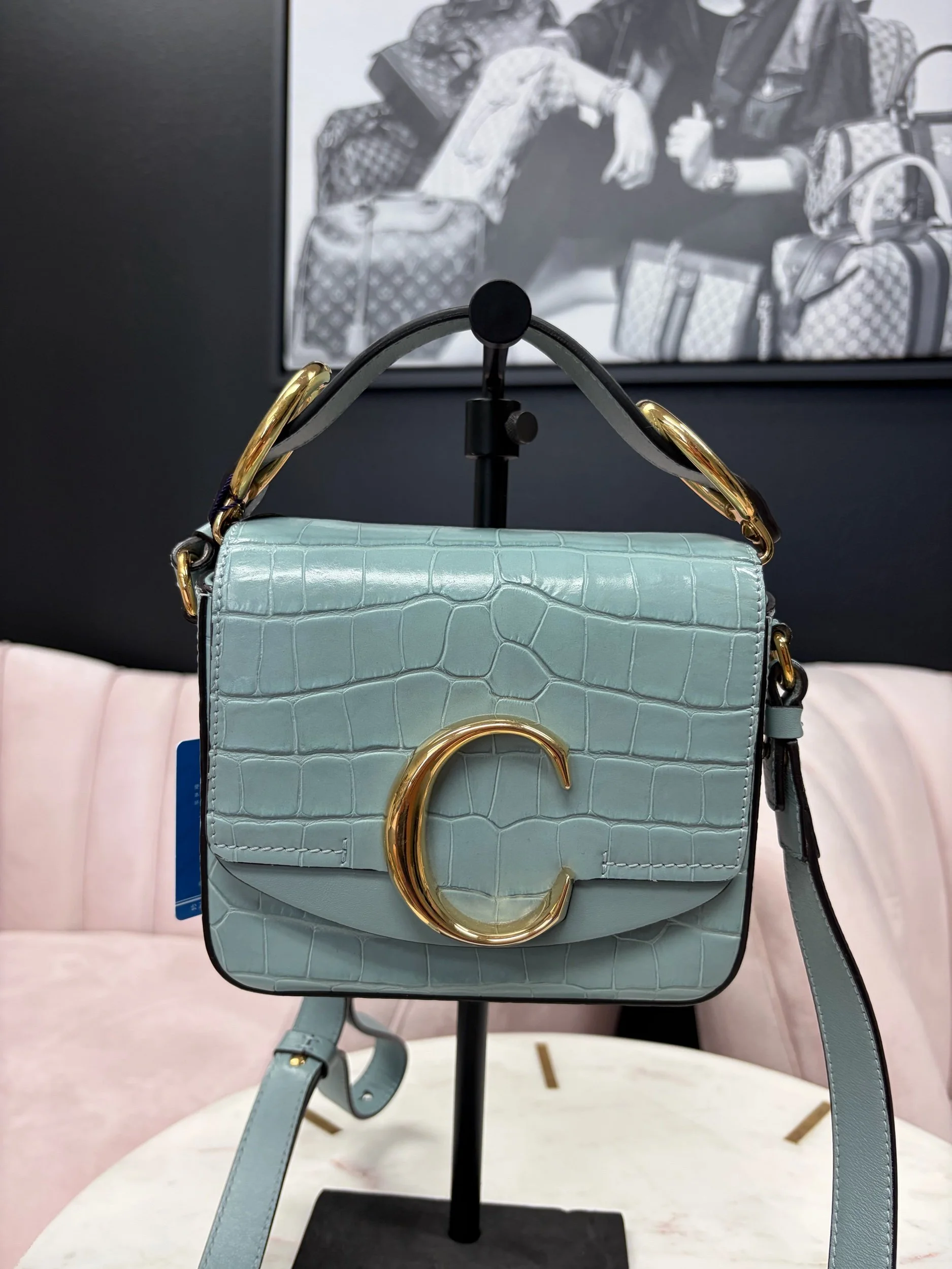 Image 1 of 5 Image 2 of 5 Image 3 of 5 Image 4 of 5 Image 5 of 5 Chloé Mini C bag crocodile $675.00 Chloé Mini C bag in a faded blue crocodile-embossed leather Purchase Added! Chloé Mini C bag in a faded blue crocodile-embossed leather