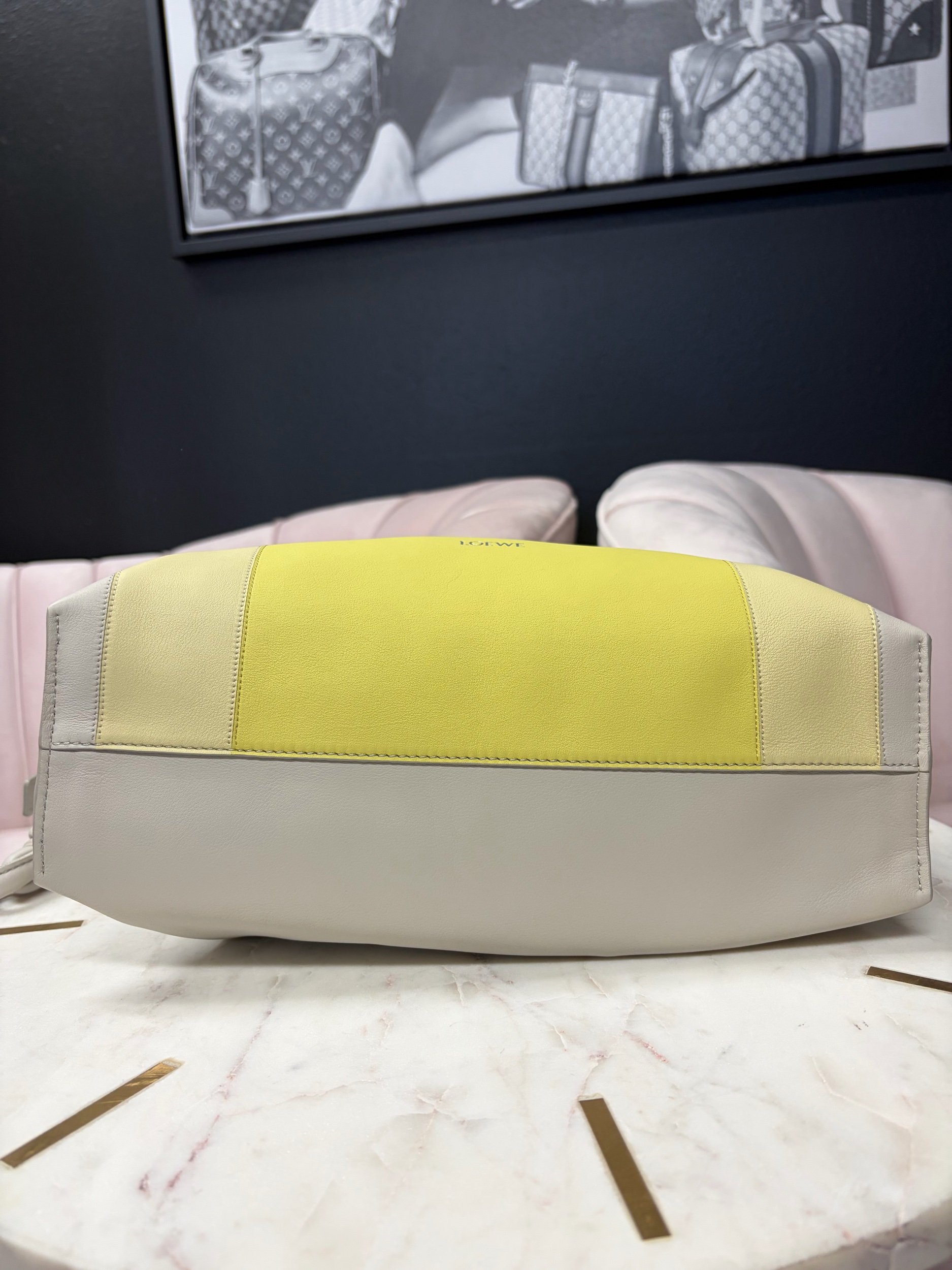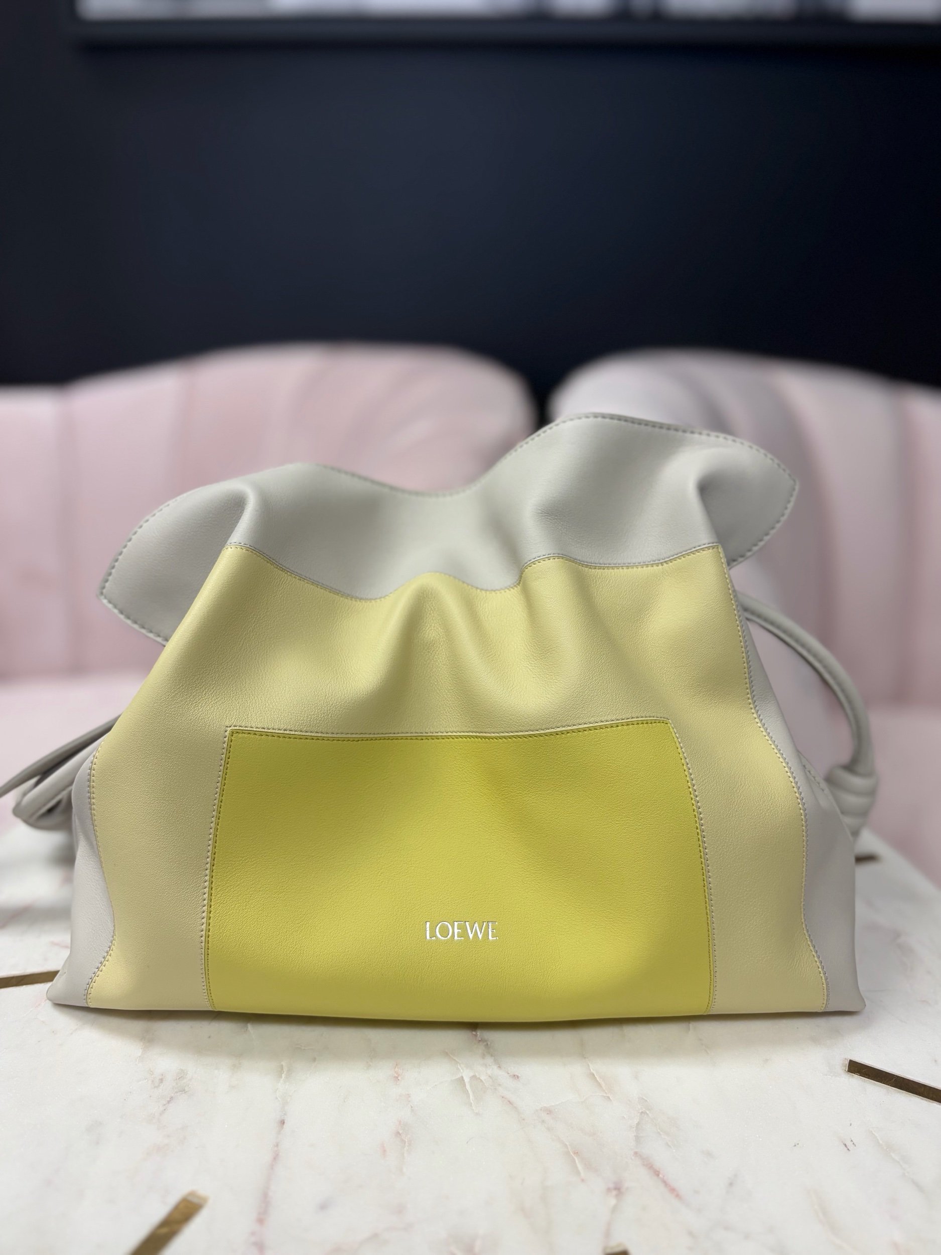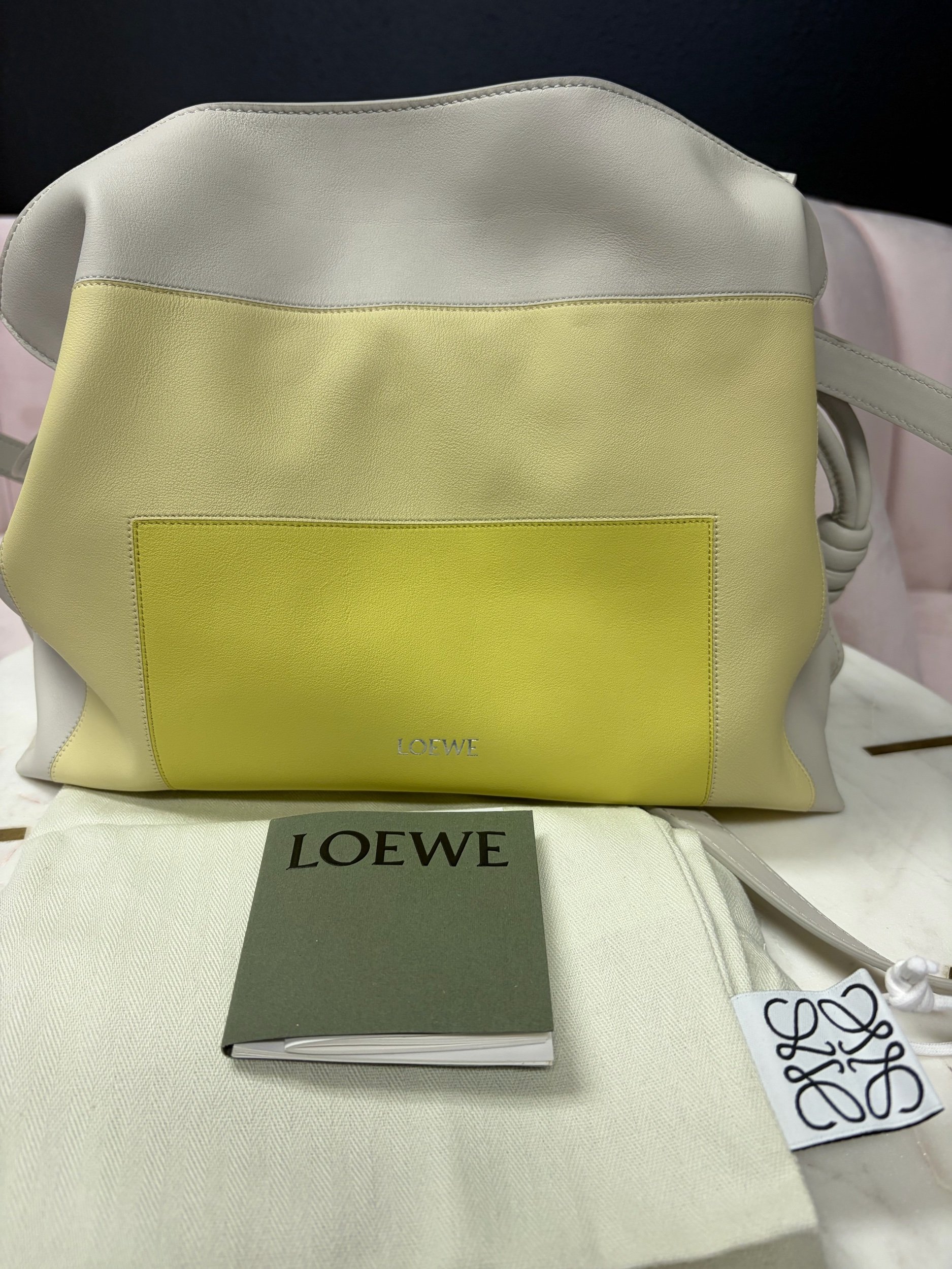 LOEWE Medium Flamenco Clutch in nappa calfskin, featuring a multicolor yellow and grey design inspired by Josef Albers's "Homage to the Square" series. Brand New.