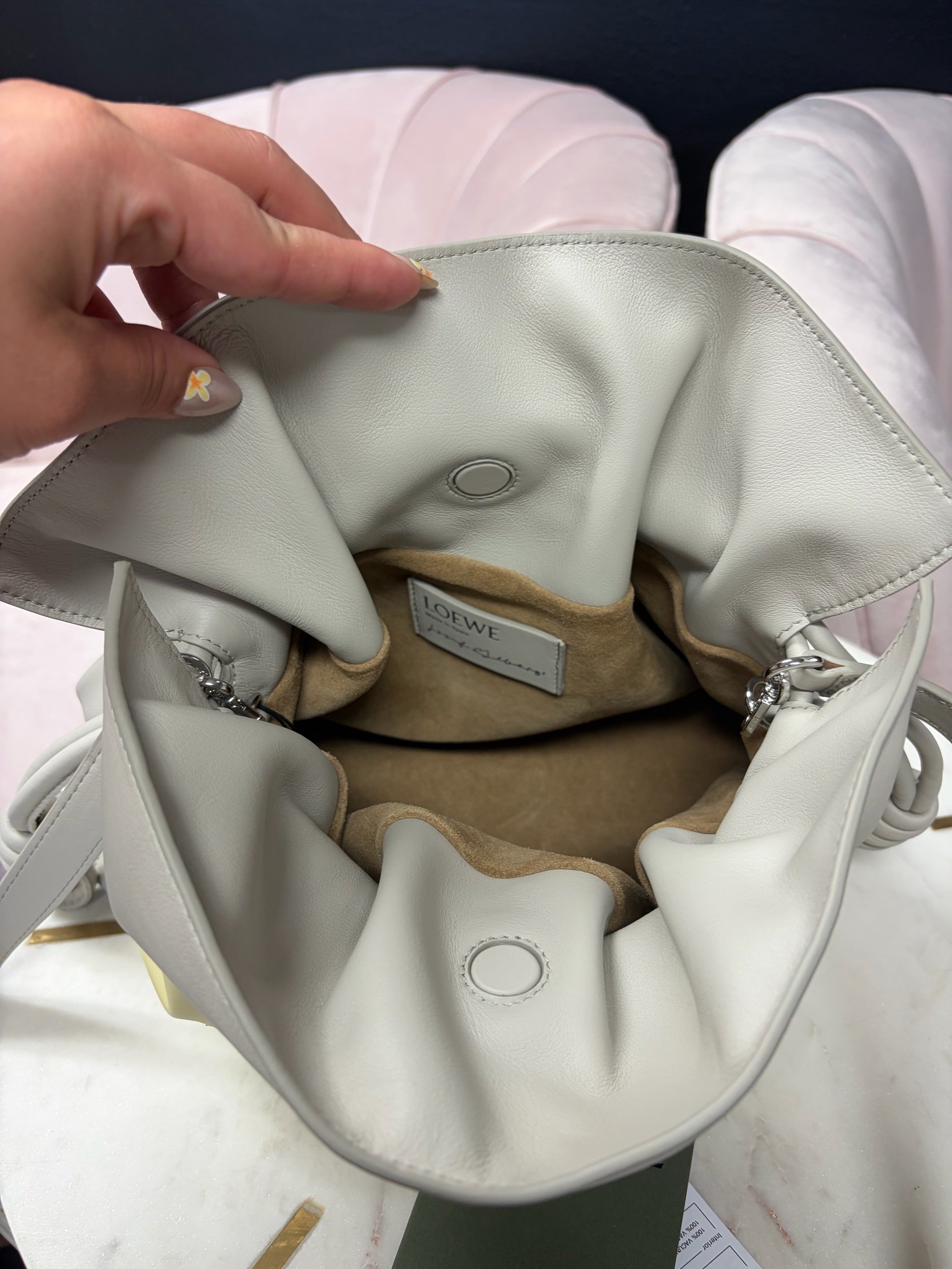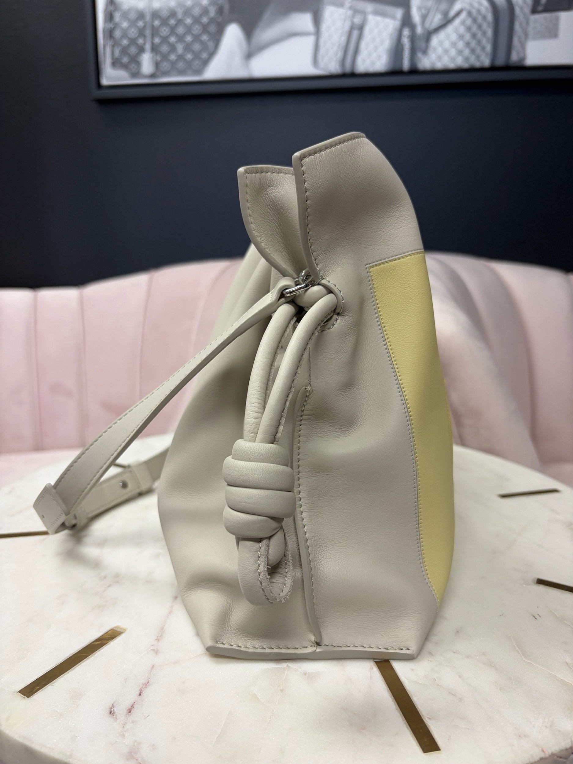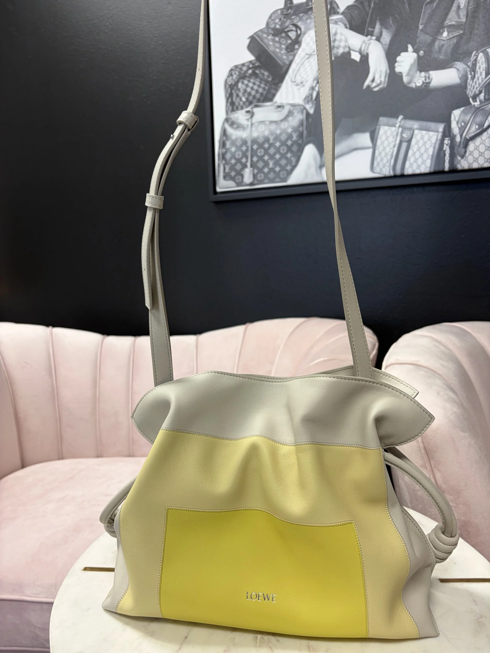 LOEWE Medium Flamenco Clutch in nappa calfskin, featuring a multicolor yellow and grey design inspired by Josef Albers's "Homage to the Square" series. Brand New.