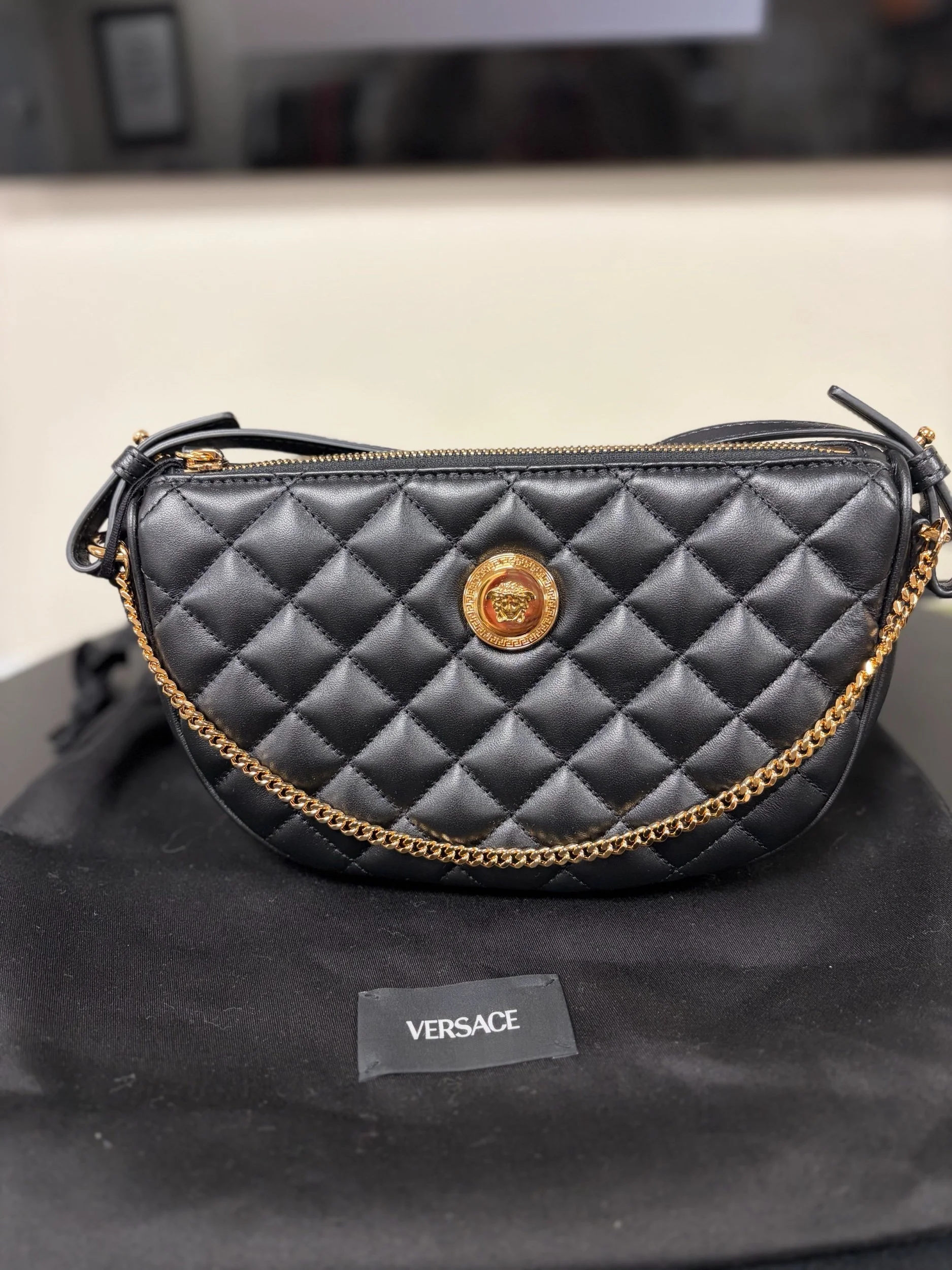 Image 1 of 5 Image 2 of 5 Image 3 of 5 Image 4 of 5 Image 5 of 5 Versace la medusa $700.00 black Versace La Medusa quilted leather crossbody bag Purchase Added! black Versace La Medusa quilted leather crossbody bag