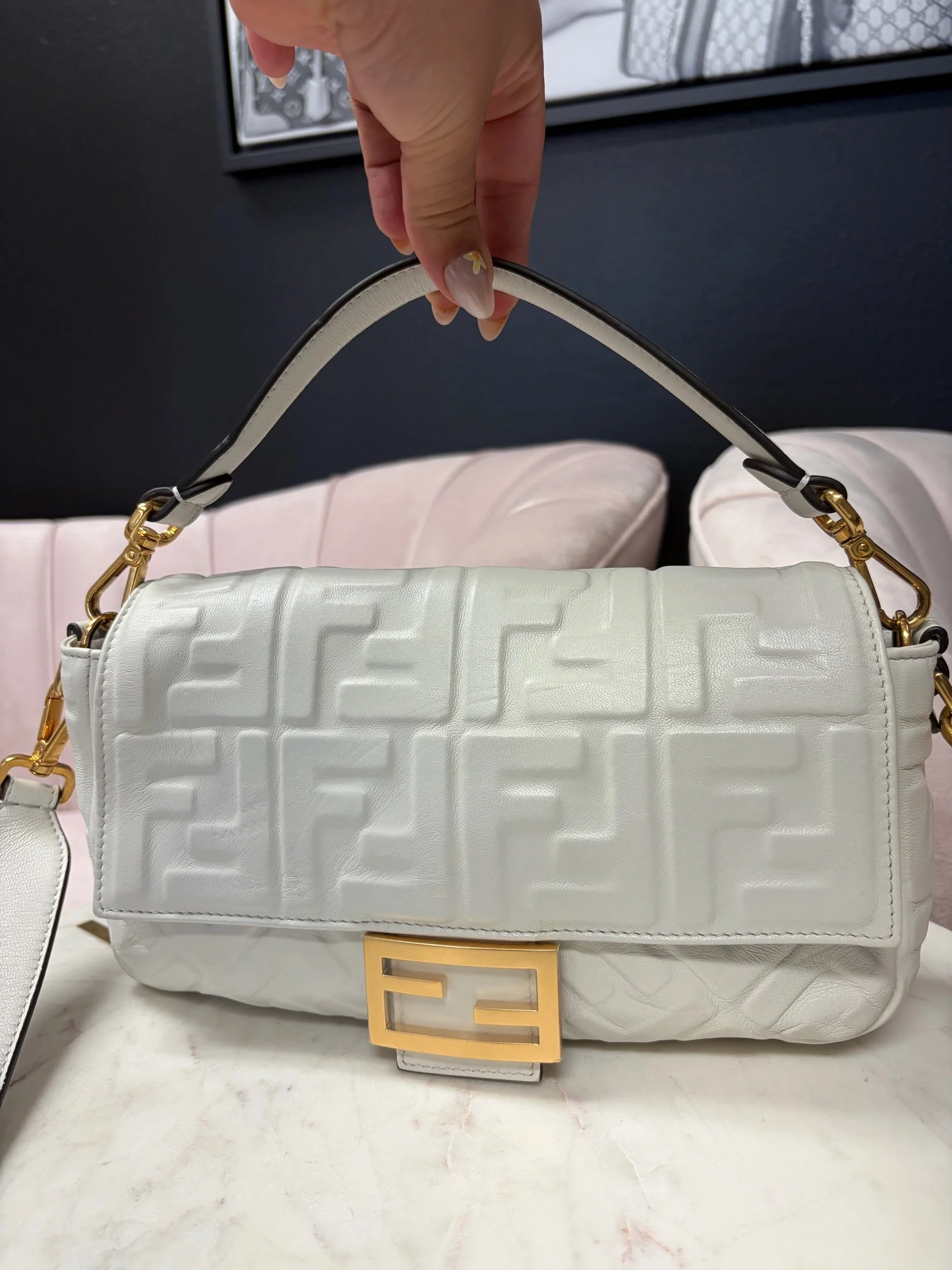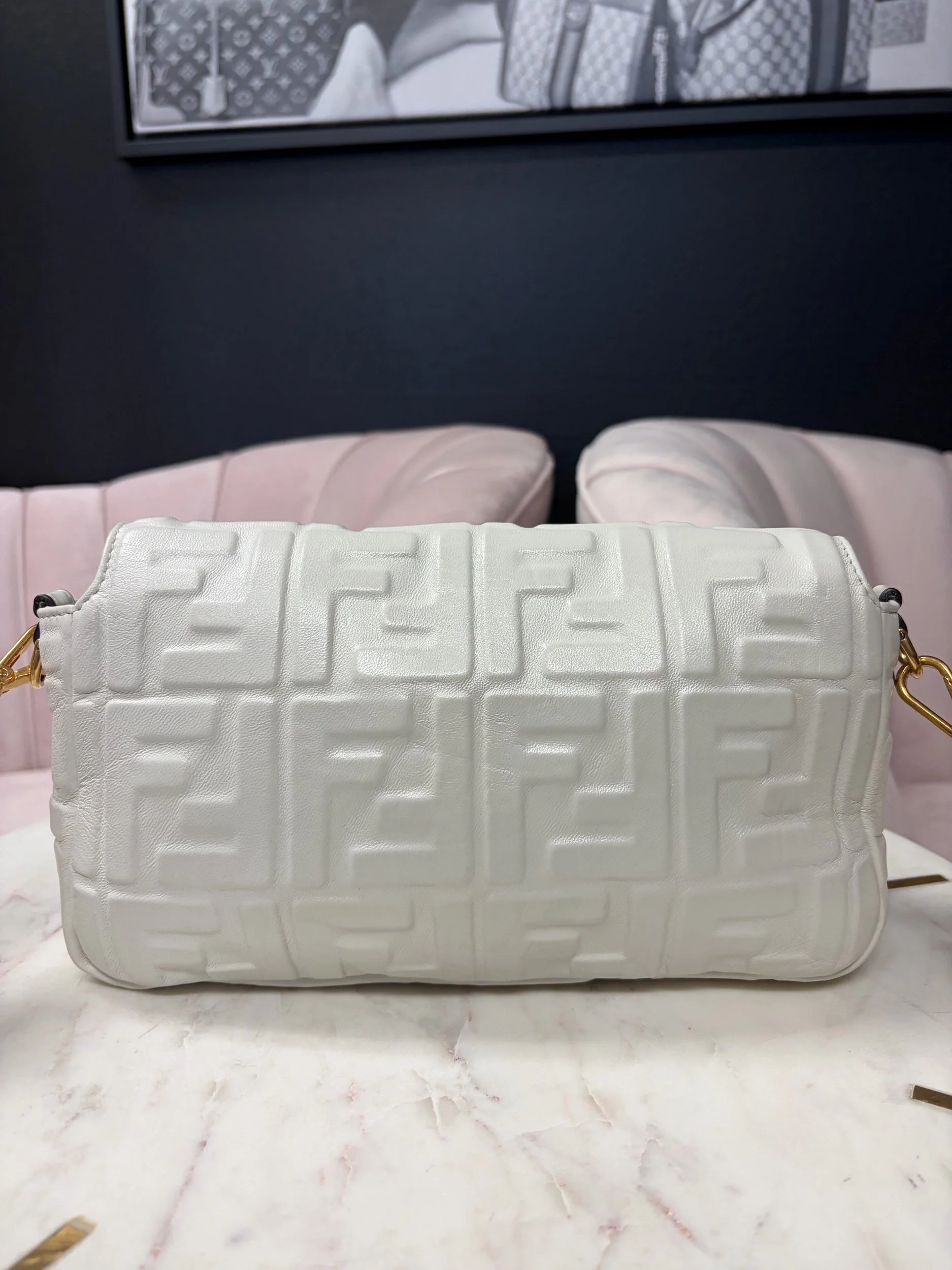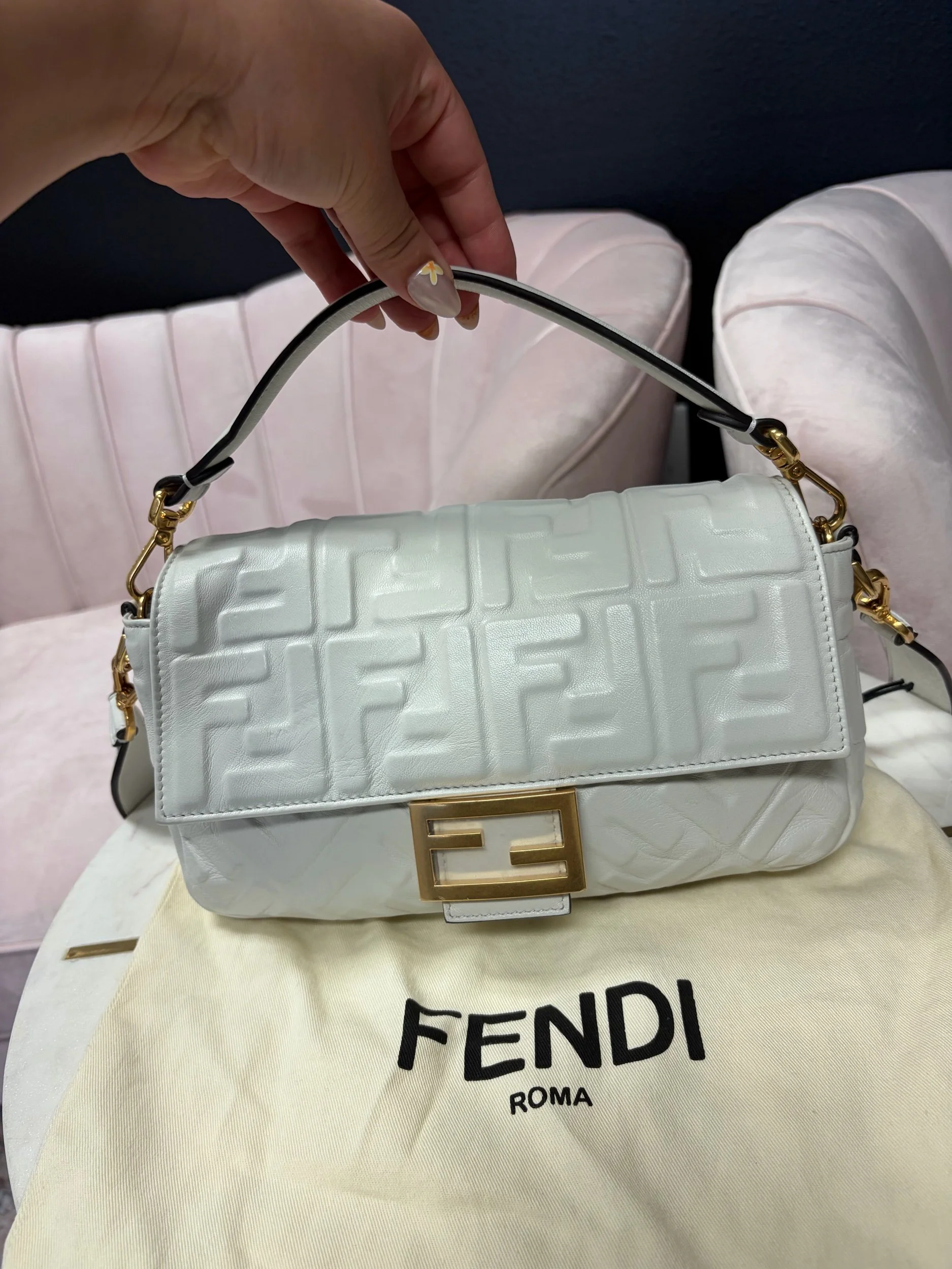 Image 1 of 7 Image 2 of 7 Image 3 of 7 Image 4 of 7 Image 5 of 7 Image 6 of 7 Image 7 of 7 Fendi Zucca Baguette bag. $1,600.00 White Fendi Zucca embossed leather Baguette bag. Comes with a removable handle and strap, good condition. Purchase Added! White Fendi Zucca embossed leather Baguette bag. Comes with a removable handle and strap, good condition.