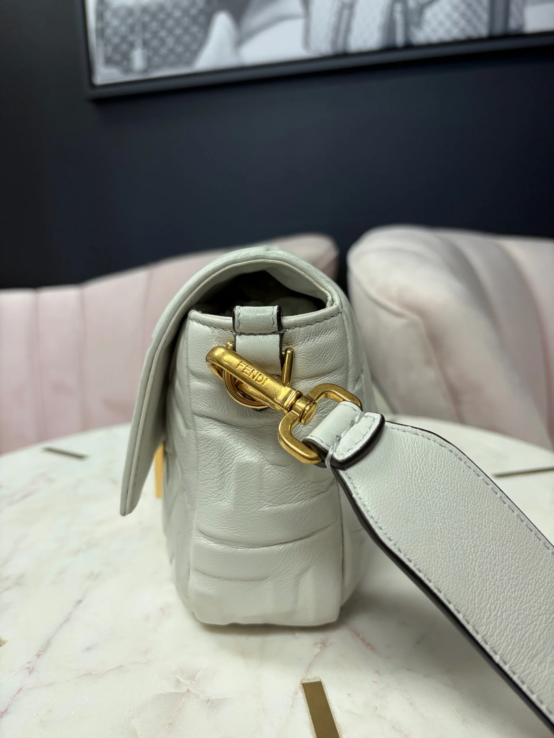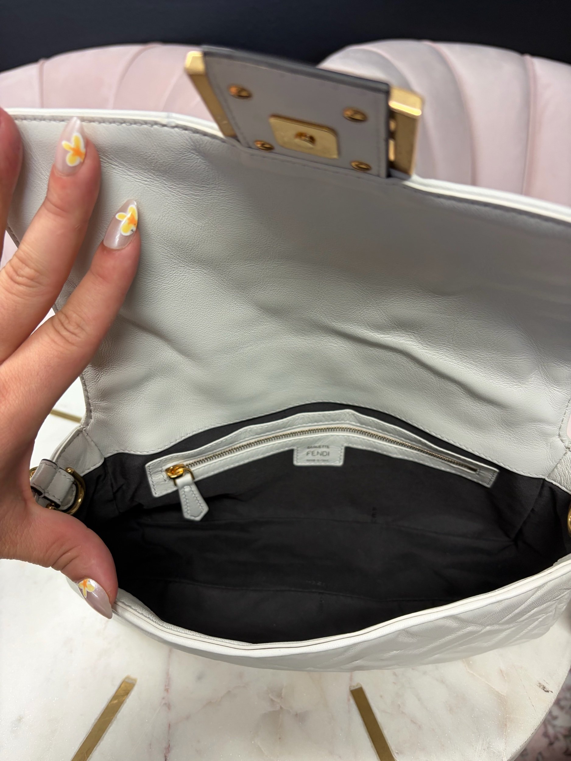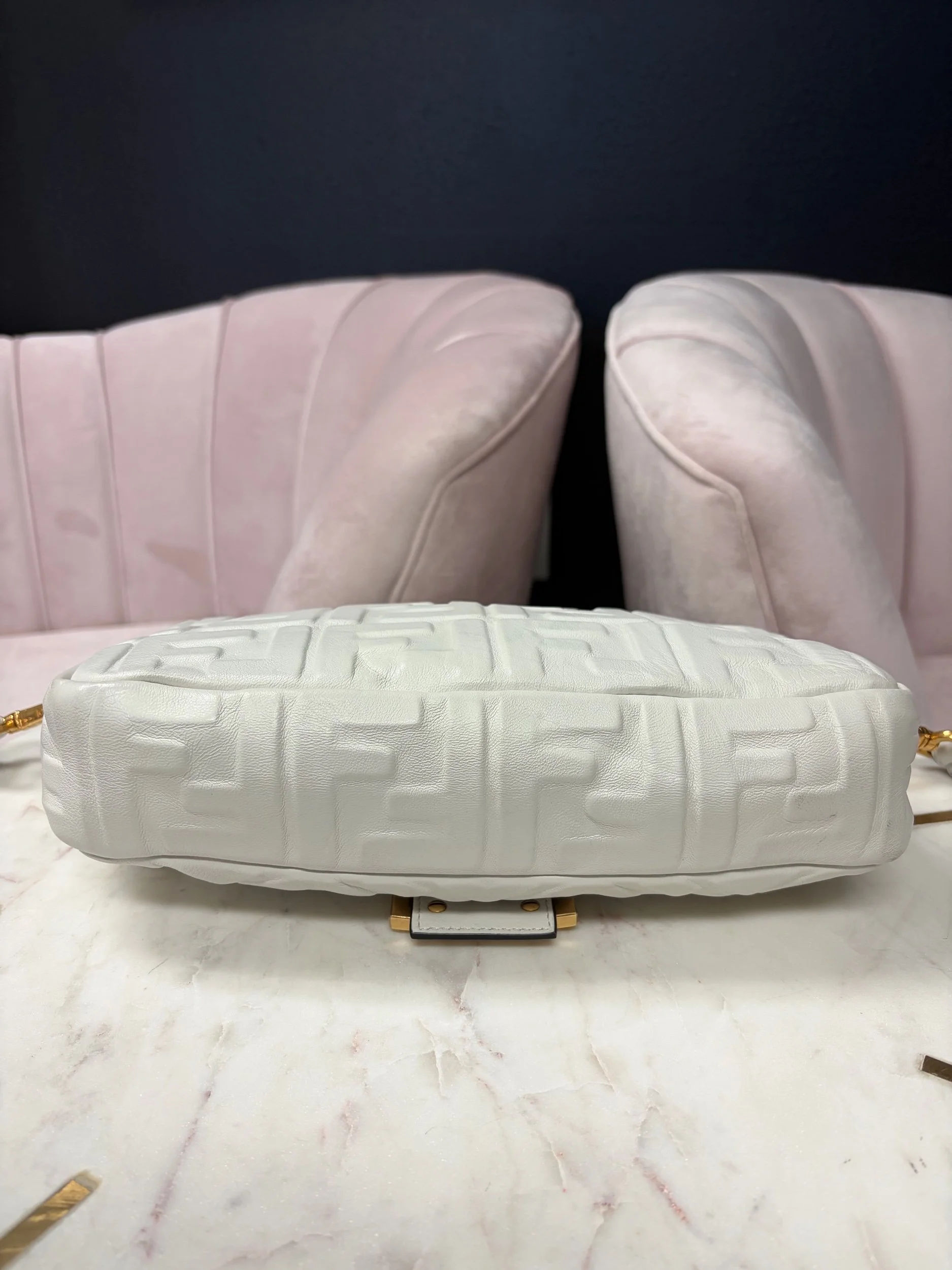 Image 1 of 7 Image 2 of 7 Image 3 of 7 Image 4 of 7 Image 5 of 7 Image 6 of 7 Image 7 of 7 Fendi Zucca Baguette bag. $1,600.00 White Fendi Zucca embossed leather Baguette bag. Comes with a removable handle and strap, good condition. Purchase Added! White Fendi Zucca embossed leather Baguette bag. Comes with a removable handle and strap, good condition.
